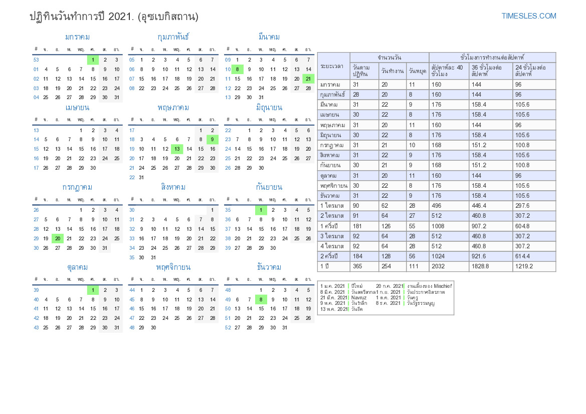 ปฏิทินวันทำการพร้อมวันหยุดและวันหยุดสุดสัปดาห์สำหรับไตรมาสที่ 4 ของปี 2021 สำหรับอุซเบกิสถาน