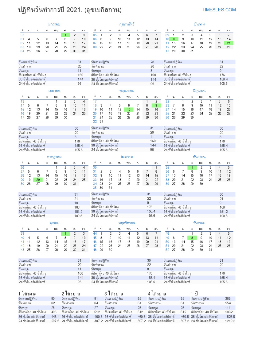 ดาวน์โหลดและพิมพ์ปฏิทินวันทำการในรูปแบบ PDF พร้อมวันหยุดและวันหยุดสุดสัปดาห์สำหรับไตรมาสที่ 4 ของปี 2021 สำหรับอุซเบกิสถาน