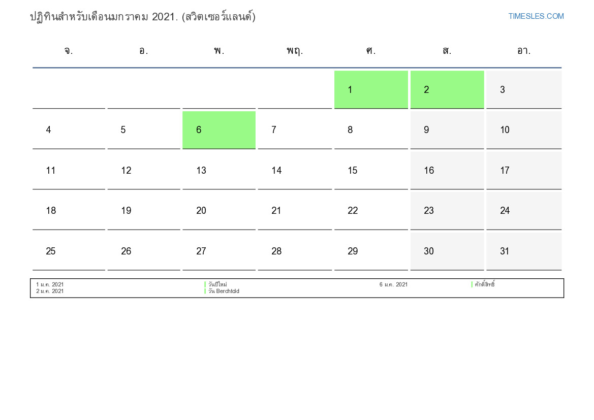 ดาวน์โหลดและพิมพ์ปฏิทิน PDF พร้อมวันหยุดและวันหยุดสุดสัปดาห์สำหรับเดือนมกราคม 2021 สำหรับสวิตเซอร์แลนด์