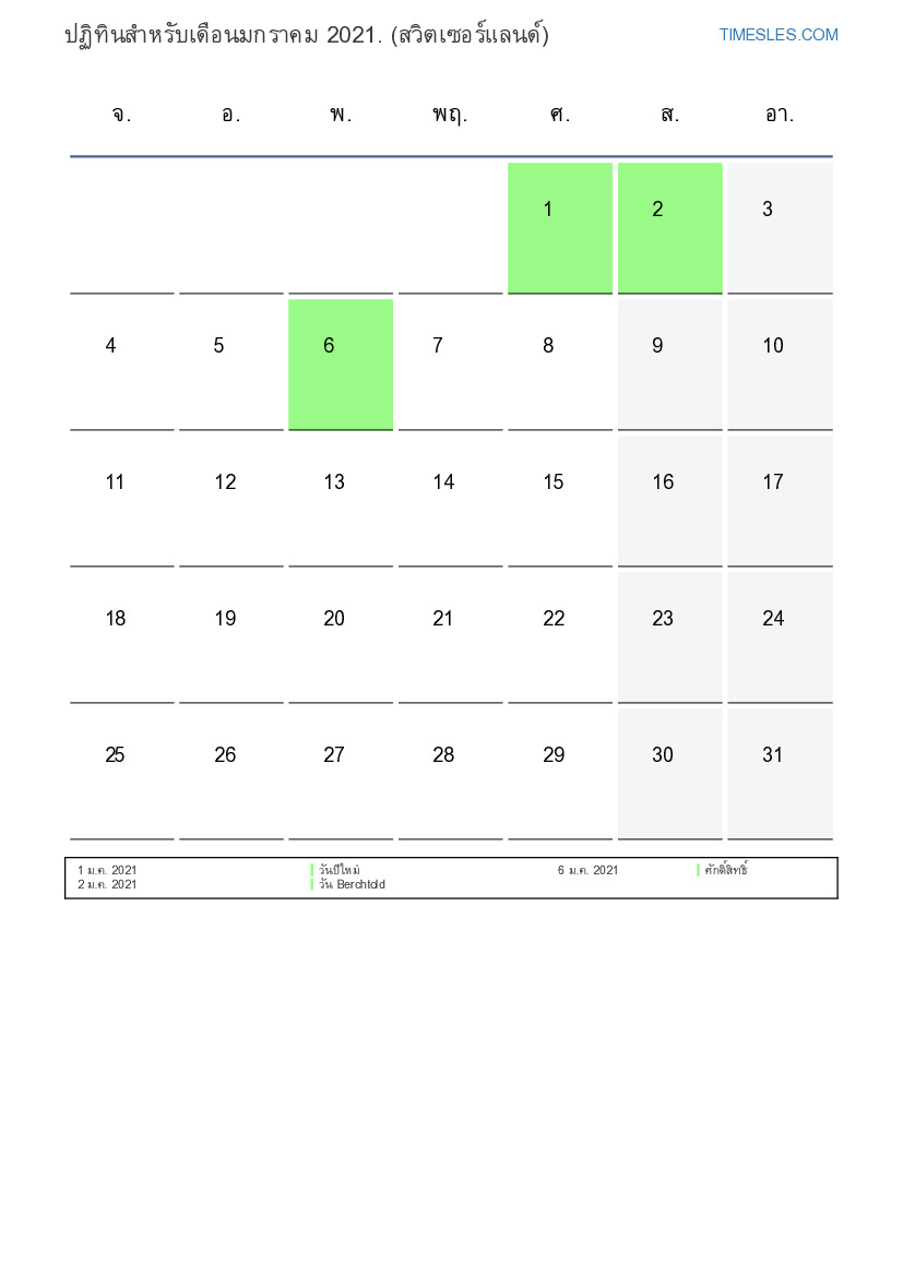 ปฏิทินวันหยุดและวันหยุดสุดสัปดาห์มกราคม 2021 สำหรับสวิตเซอร์แลนด์