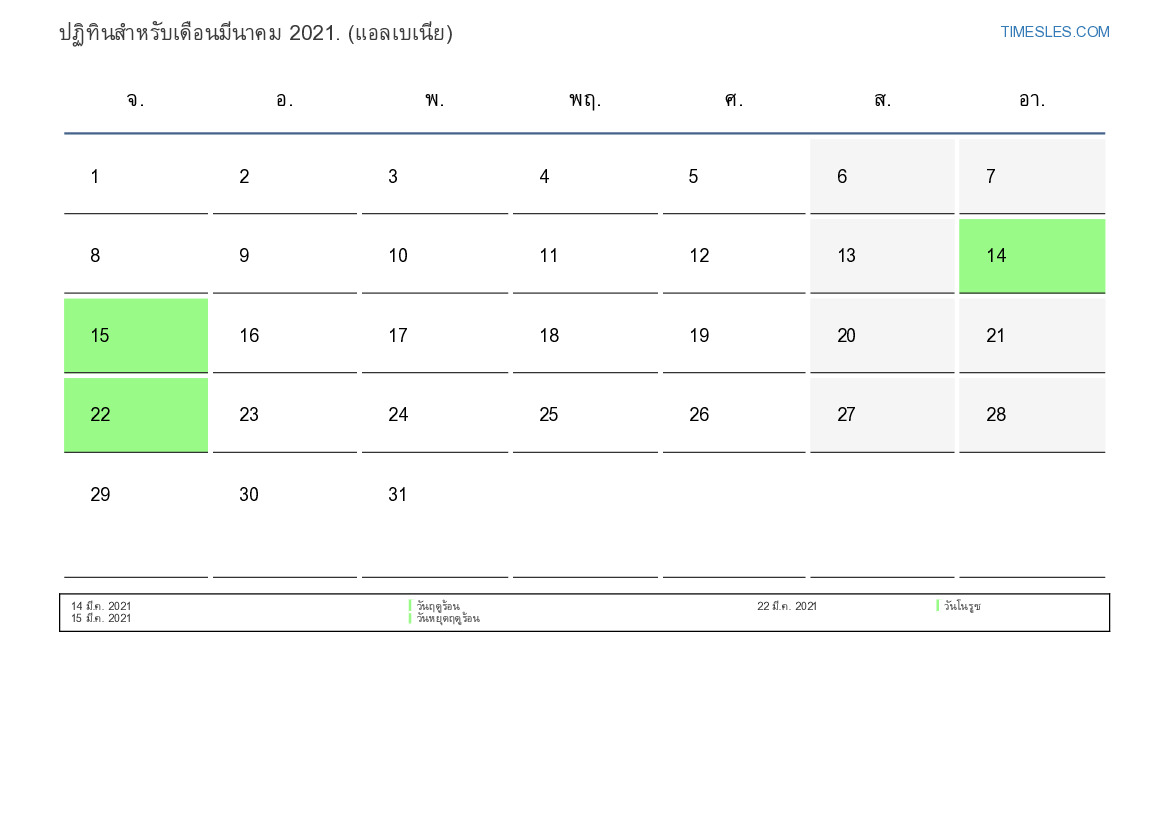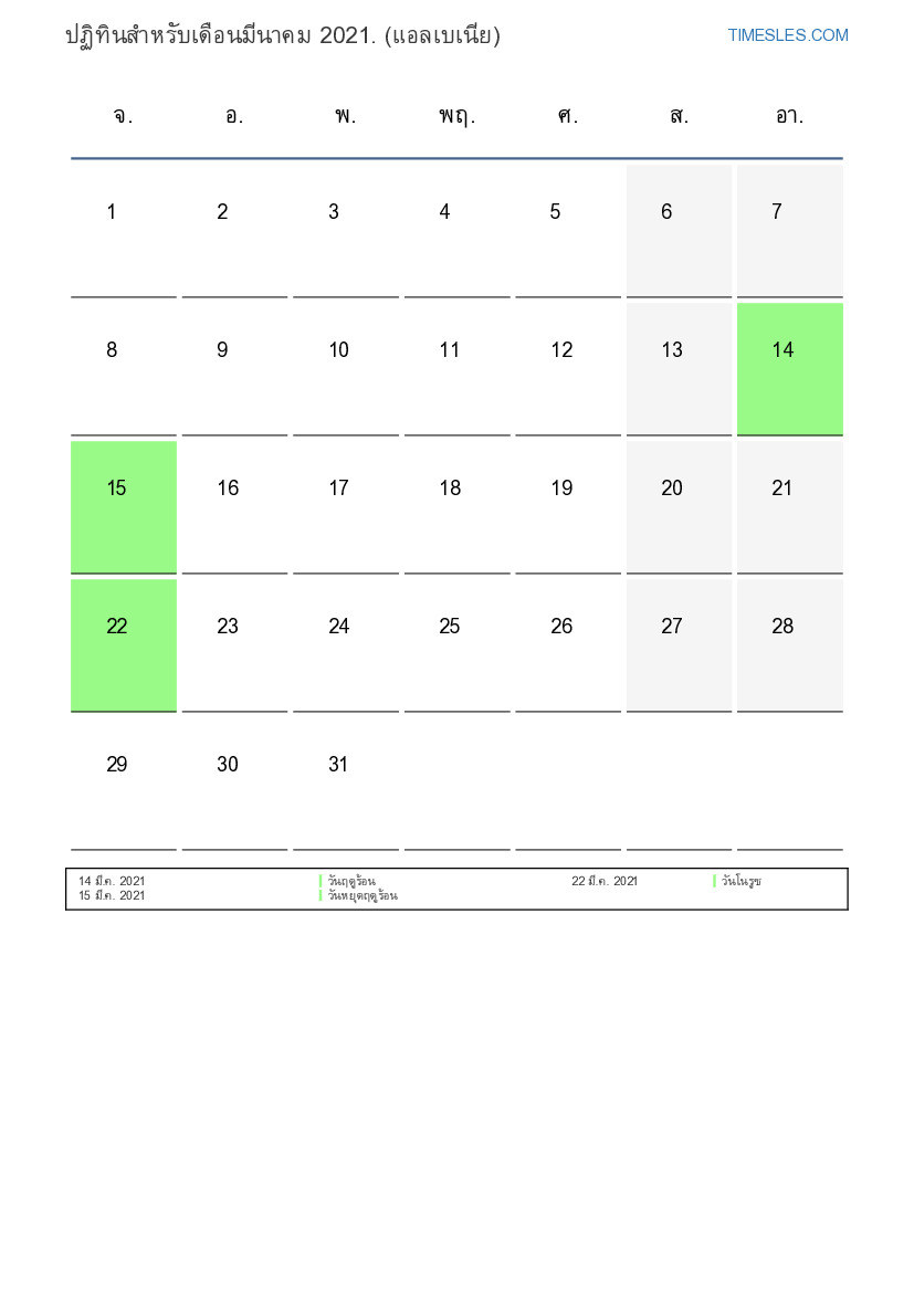 เดือนมีนาคมมี 31 วัน วัน นี่คือ 3 เดือนของปี 2021 ฤดูกาลของปี: ฤดูใบไม้ผลิ เดือนมีนาคมเริ่มในวันจันทร์และสิ้นสุดในวันพุธ ในเดือนมีนาคม 2021 มี6 วันหยุดและวันหยุดในอัลบานี