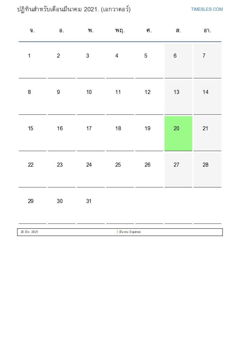 เดือนมีนาคมมี 31 วัน วัน นี่คือ 3 เดือนของปี 2021 ฤดูกาลของปี: ฤดูใบไม้ผลิ เดือนมีนาคมเริ่มในวันจันทร์และสิ้นสุดในวันพุธ ในเดือนมีนาคม 2021 มี1 วันหยุดและวันหยุดในเอกวาดอร์