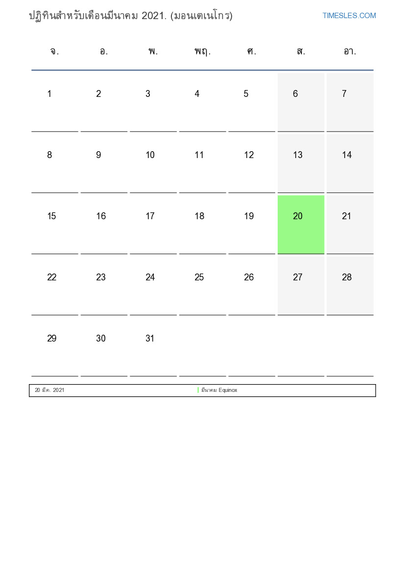 เดือนมีนาคมมี 31 วัน วัน นี่คือ 3 เดือนของปี 2021 ฤดูกาลของปี: ฤดูใบไม้ผลิ เดือนมีนาคมเริ่มในวันจันทร์และสิ้นสุดในวันพุธ ในเดือนมีนาคม 2021 มี1 วันหยุดและวันหยุดในมอนเตเนโกร