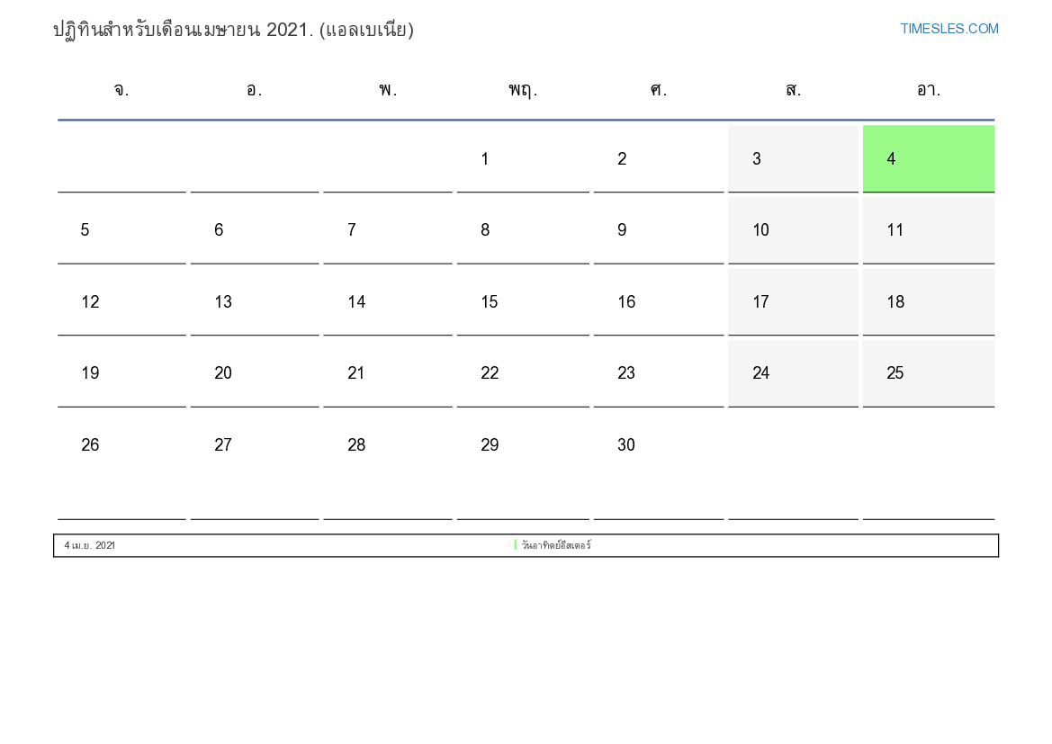 เดือนเมษายนมี 30 วัน วัน นี่คือ 4 เดือนของปี 2021 ฤดูกาลของปี: ฤดูใบไม้ผลิ เดือนเมษายนเริ่มในวันพฤหัสบดีที่และสิ้นสุดในวันศุกร์ ในเดือนเมษายน 2021 มี5 วันหยุดและวันหยุดในอัลบานี