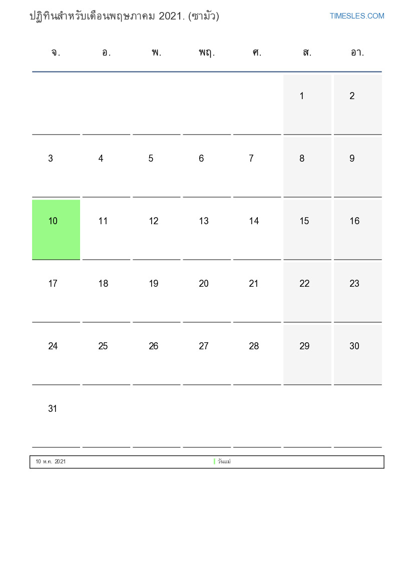 เดือนพฤษภาคมมี 31 วัน วัน นี่คือ 5 เดือนของปี 2021 ฤดูกาลของปี: ฤดูใบไม้ผลิ เดือนพฤษภาคมเริ่มวันเสาร์และสิ้นสุดในวันจันทร์ ในเดือนพฤษภาคม 2021 มี1 วันหยุดและวันหยุดในซามัว