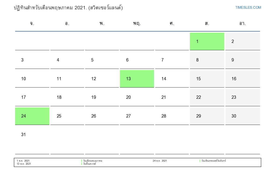 ดาวน์โหลดและพิมพ์ปฏิทิน PDF พร้อมวันหยุดและวันหยุดสุดสัปดาห์สำหรับเดือนพฤษภาคม 2021 สำหรับสวิตเซอร์แลนด์