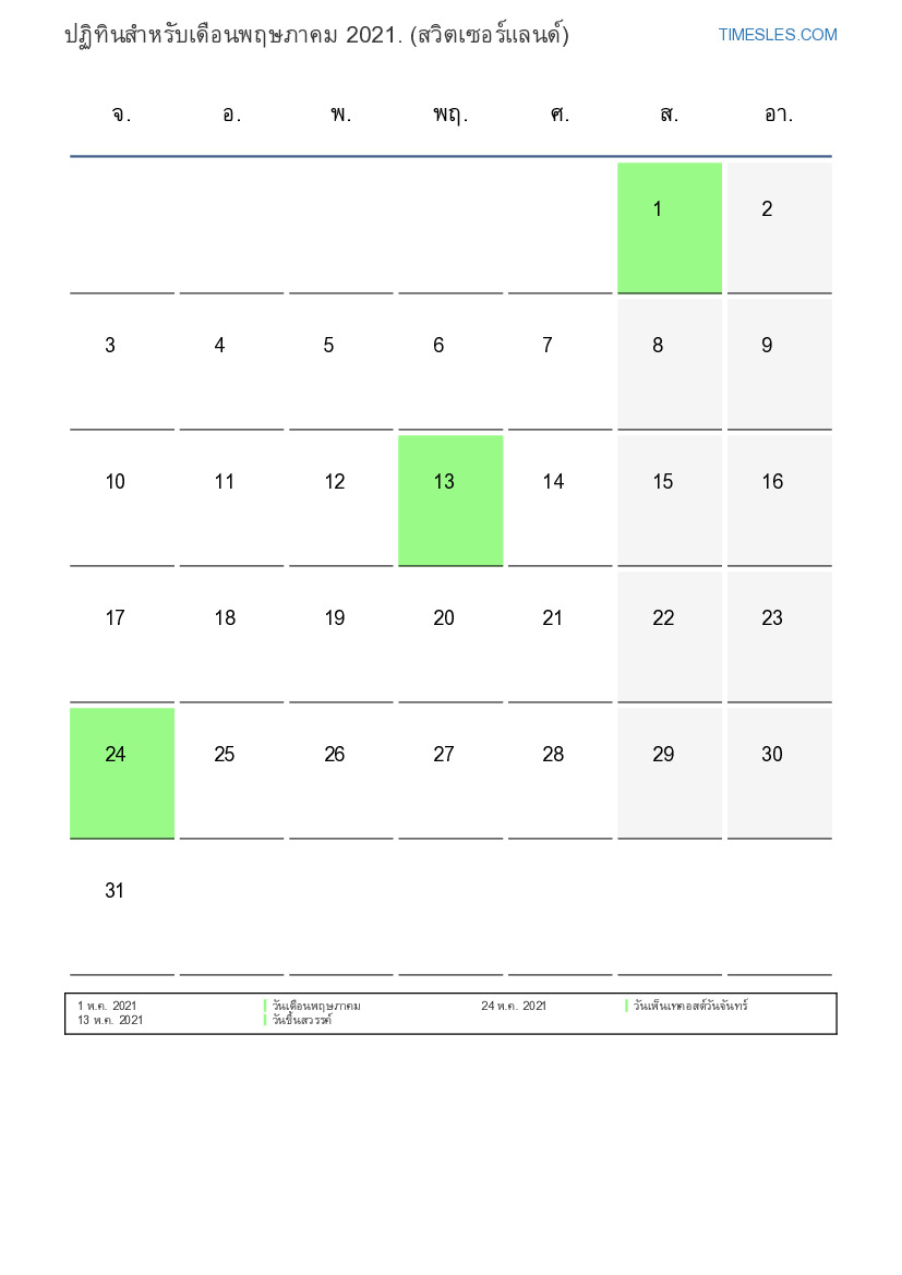 ปฏิทินเดือนพฤษภาคม 2021 สำหรับสวิตเซอร์แลนด์