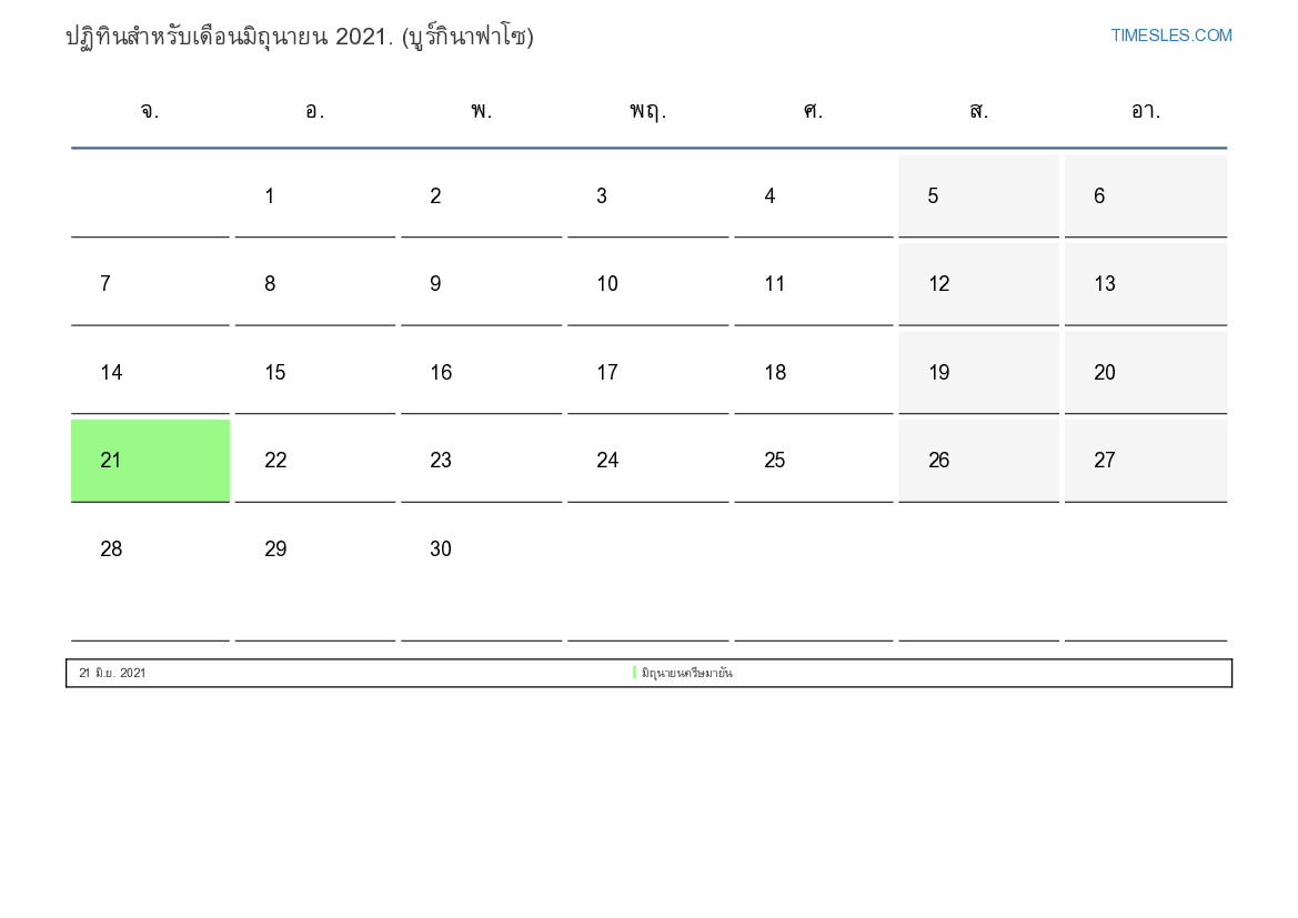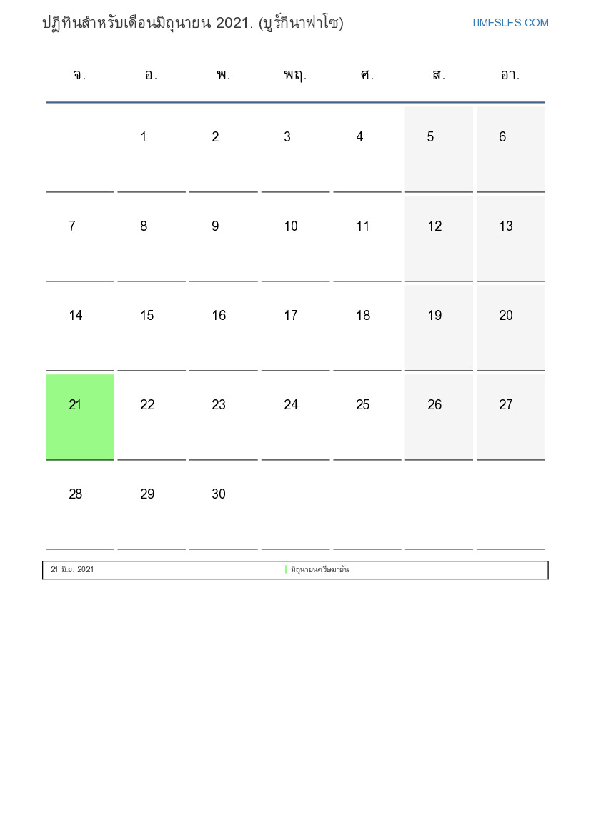 ปฏิทินวันหยุดและวันหยุดสุดสัปดาห์มิถุนายน 2021 สำหรับบูร์กินาฟาโซ