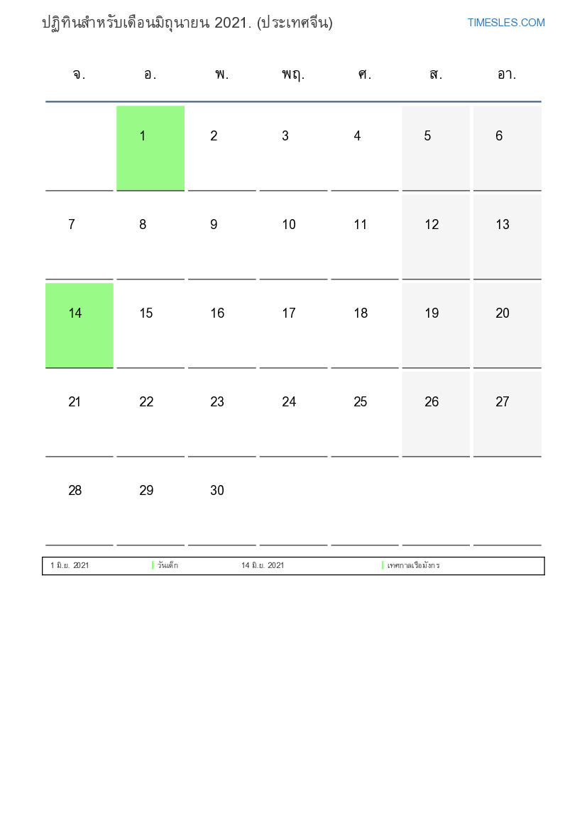 ปฏิทินเดือนมิถุนายน 2021 สำหรับประเทศจีน