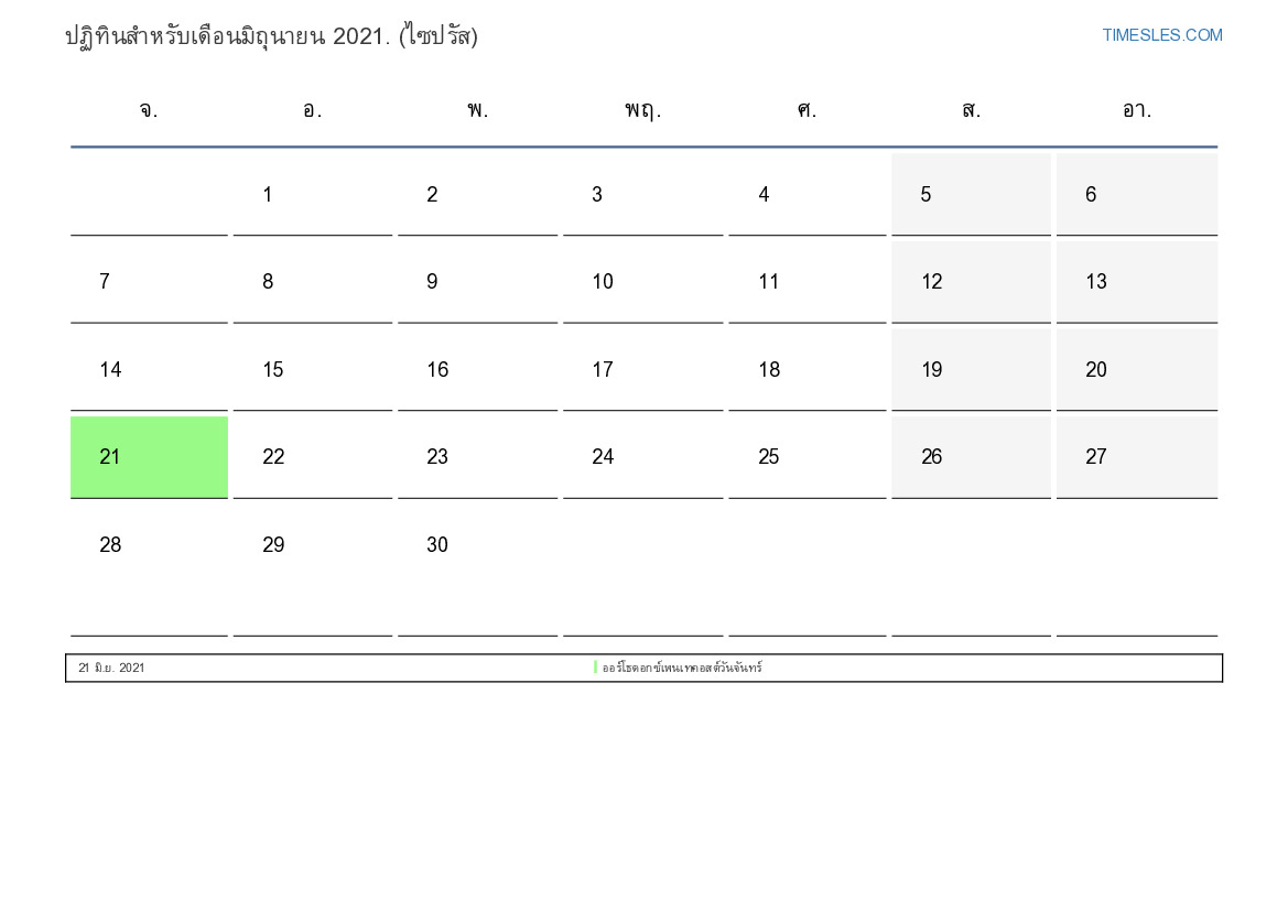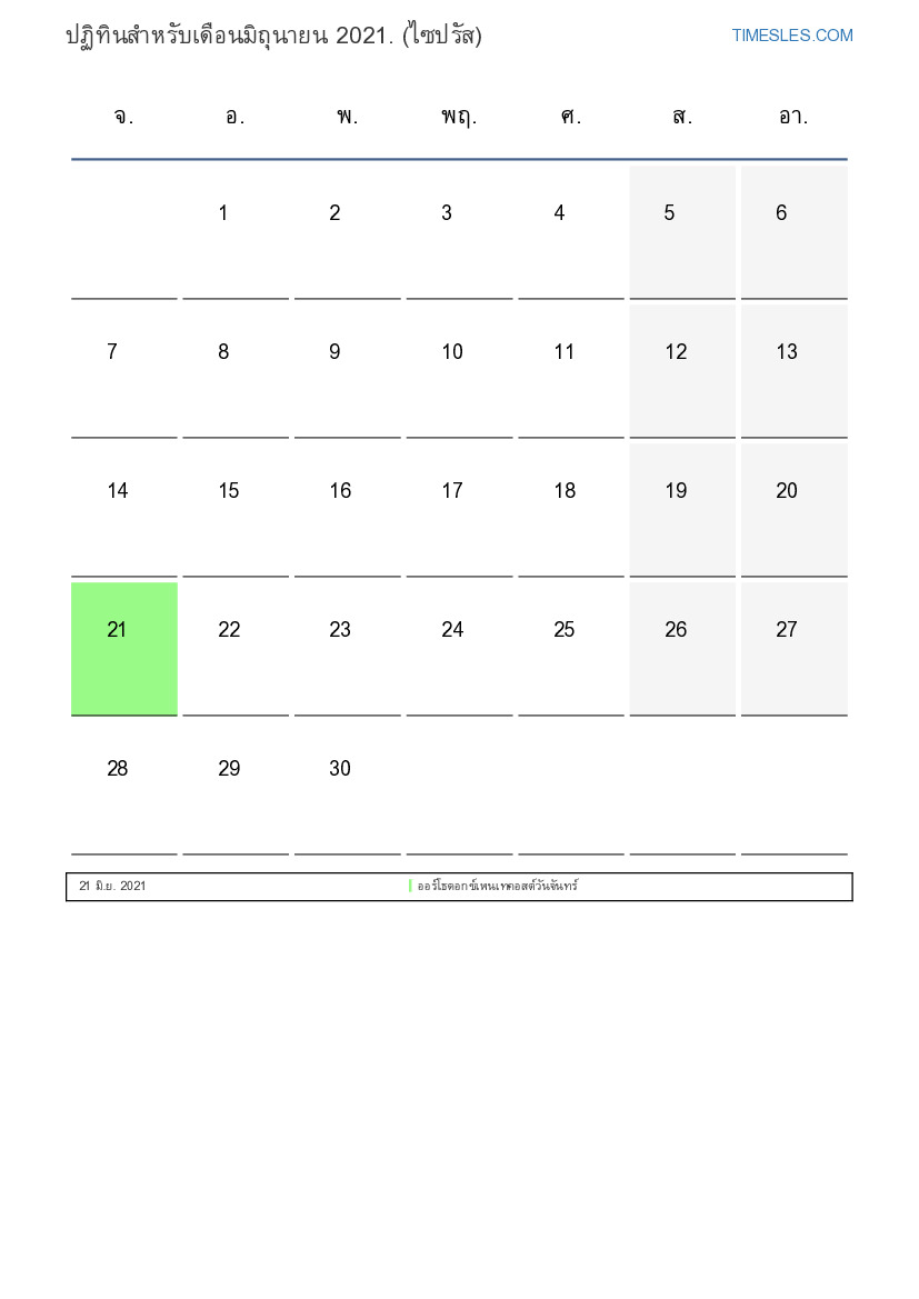 เดือนมิถุนายนมี 30 วัน วัน นี่คือ 6 เดือนของปี 2021 ฤดูกาลของปี: ฤดูร้อน เดือนมิถุนายนเริ่มในวันอังคารและสิ้นสุดในวันพุธ ในเดือนมิถุนายน 2021 มี2 วันหยุดและวันหยุดในไซปรัส