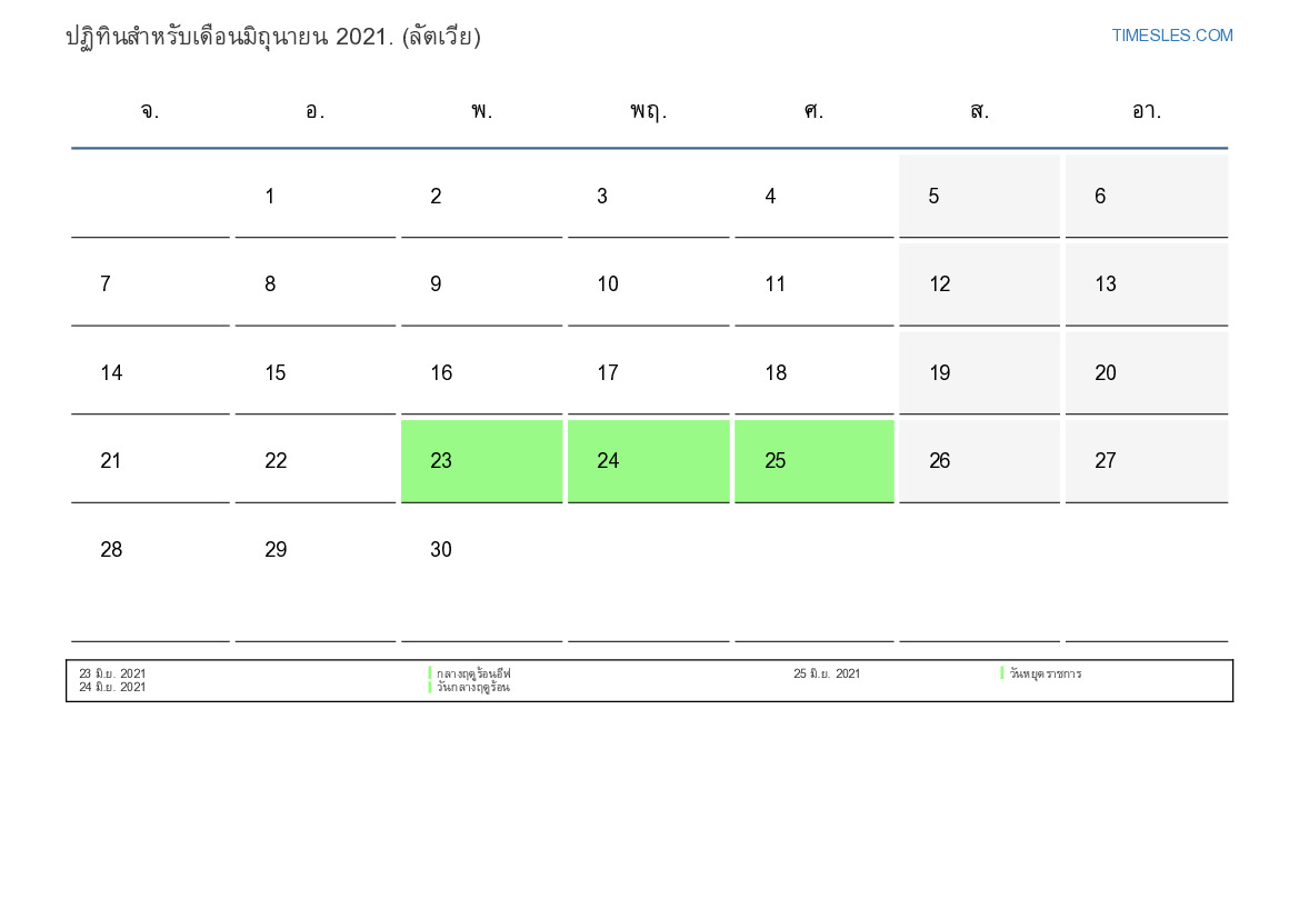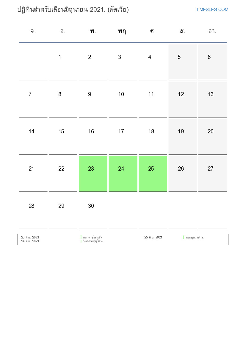 ปฏิทินวันหยุดและวันหยุดสุดสัปดาห์มิถุนายน 2021 สำหรับลัตเวีย
