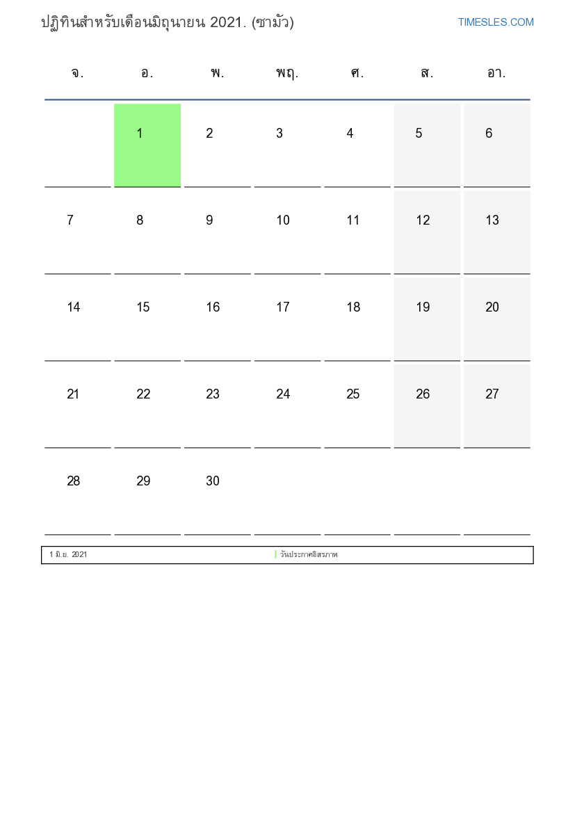 เดือนมิถุนายนมี 30 วัน วัน นี่คือ 6 เดือนของปี 2021 ฤดูกาลของปี: ฤดูร้อน เดือนมิถุนายนเริ่มในวันอังคารและสิ้นสุดในวันพุธ ในเดือนมิถุนายน 2021 มี2 วันหยุดและวันหยุดในซามัว