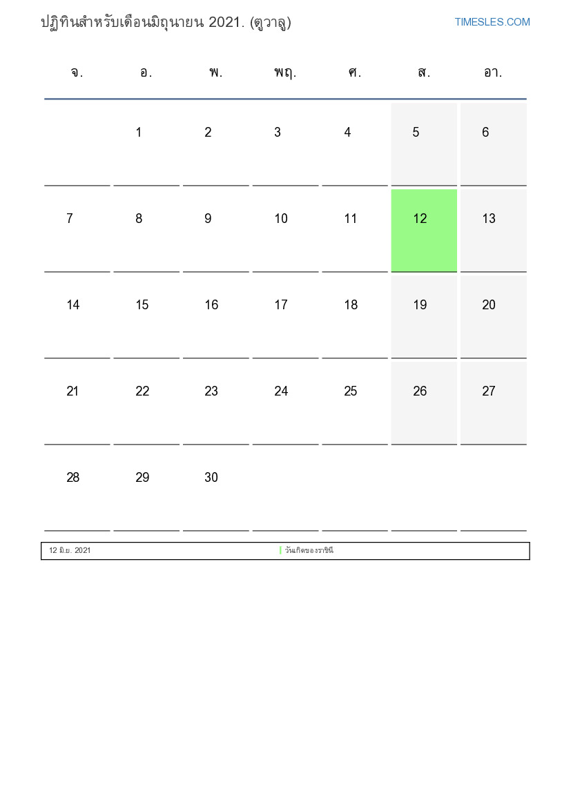 ดาวน์โหลดและพิมพ์ปฏิทิน PDF พร้อมวันหยุดและวันหยุดสุดสัปดาห์สำหรับเดือนมิถุนายน 2021 สำหรับตูวาลู
