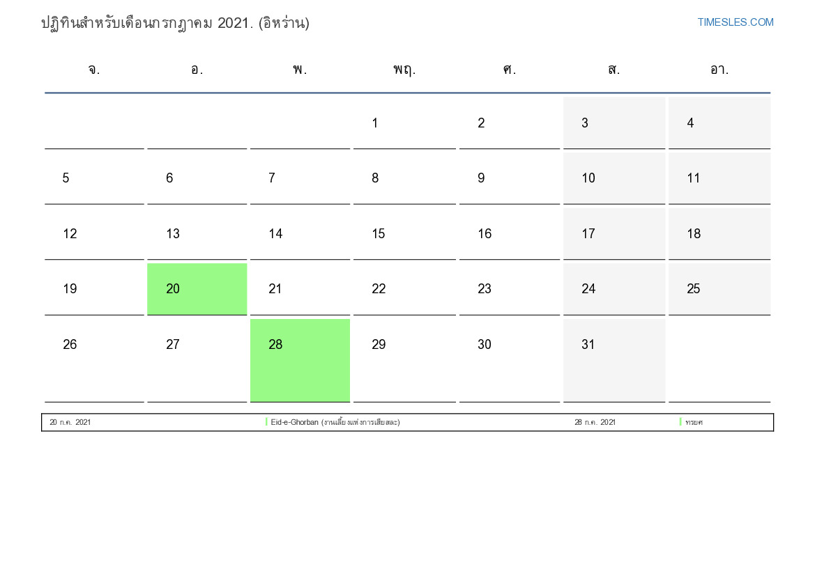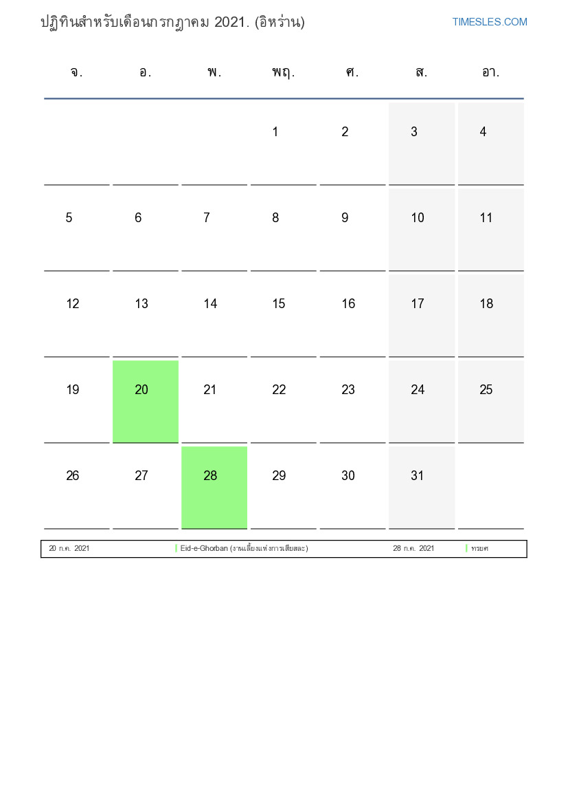 ดาวน์โหลดและพิมพ์ปฏิทิน PDF พร้อมวันหยุดและวันหยุดสุดสัปดาห์สำหรับเดือนกรกฎาคม 2021 สำหรับอิหร่าน