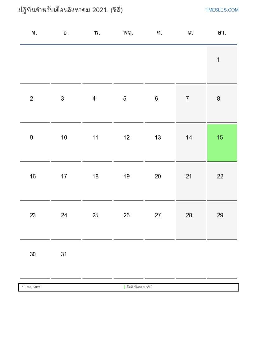 เดือนสิงหาคมมี 31 วัน วัน นี่คือ 8 เดือนของปี 2021 ฤดูกาลของปี: ฤดูร้อน เดือนสิงหาคมเริ่มในวันอาทิตย์และสิ้นสุดในวันอังคาร ในเดือนสิงหาคม 2021 มี1 วันหยุดและวันหยุดในชิลี