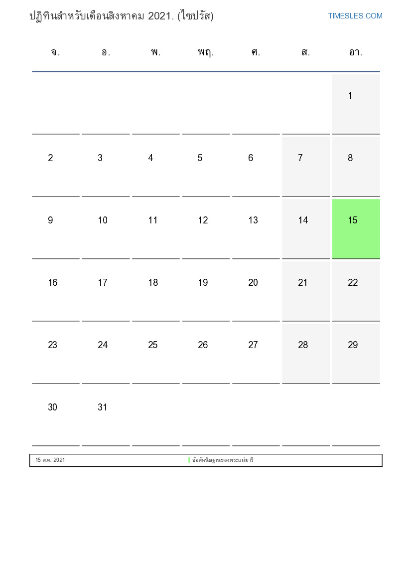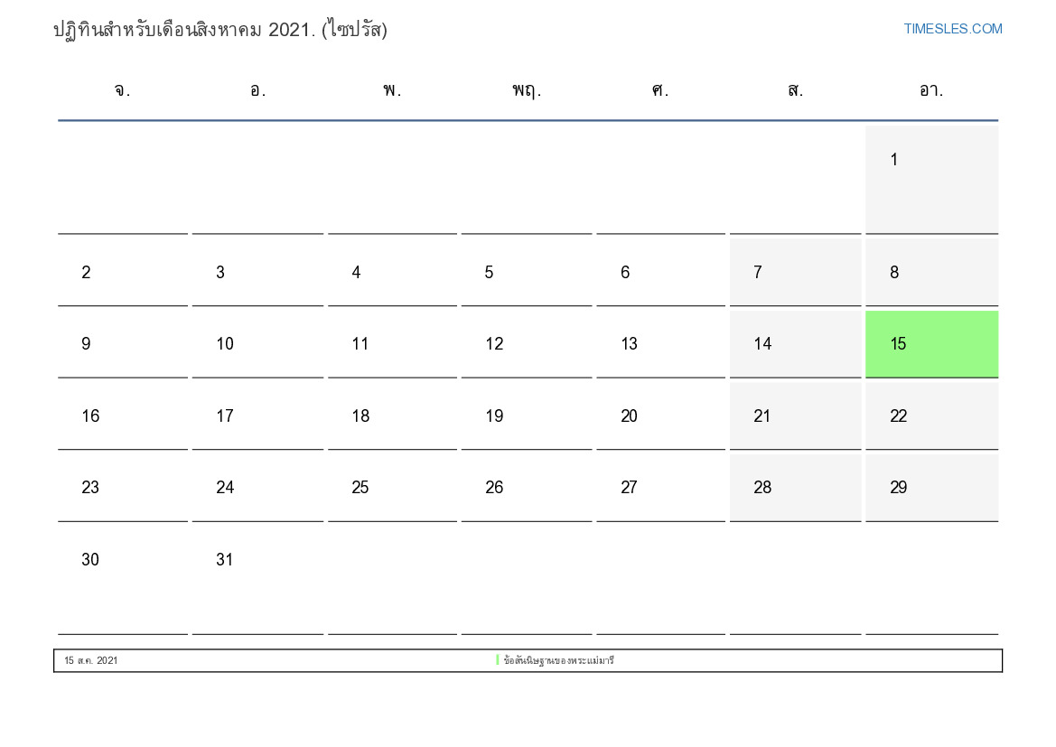 เดือนสิงหาคมมี 31 วัน วัน นี่คือ 8 เดือนของปี 2021 ฤดูกาลของปี: ฤดูร้อน เดือนสิงหาคมเริ่มในวันอาทิตย์และสิ้นสุดในวันอังคาร ในเดือนสิงหาคม 2021 มี1 วันหยุดและวันหยุดในไซปรัส