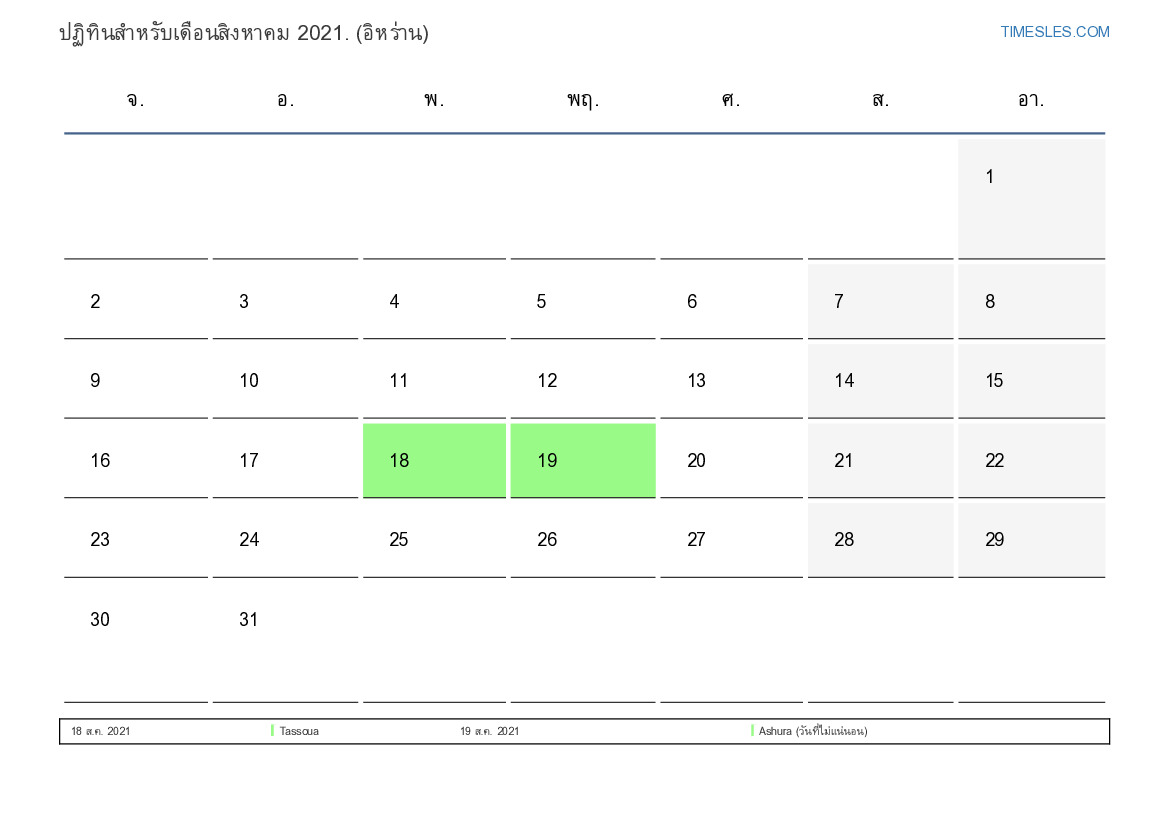 ดาวน์โหลดและพิมพ์ปฏิทิน PDF พร้อมวันหยุดและวันหยุดสุดสัปดาห์สำหรับเดือนสิงหาคม 2021 สำหรับอิหร่าน