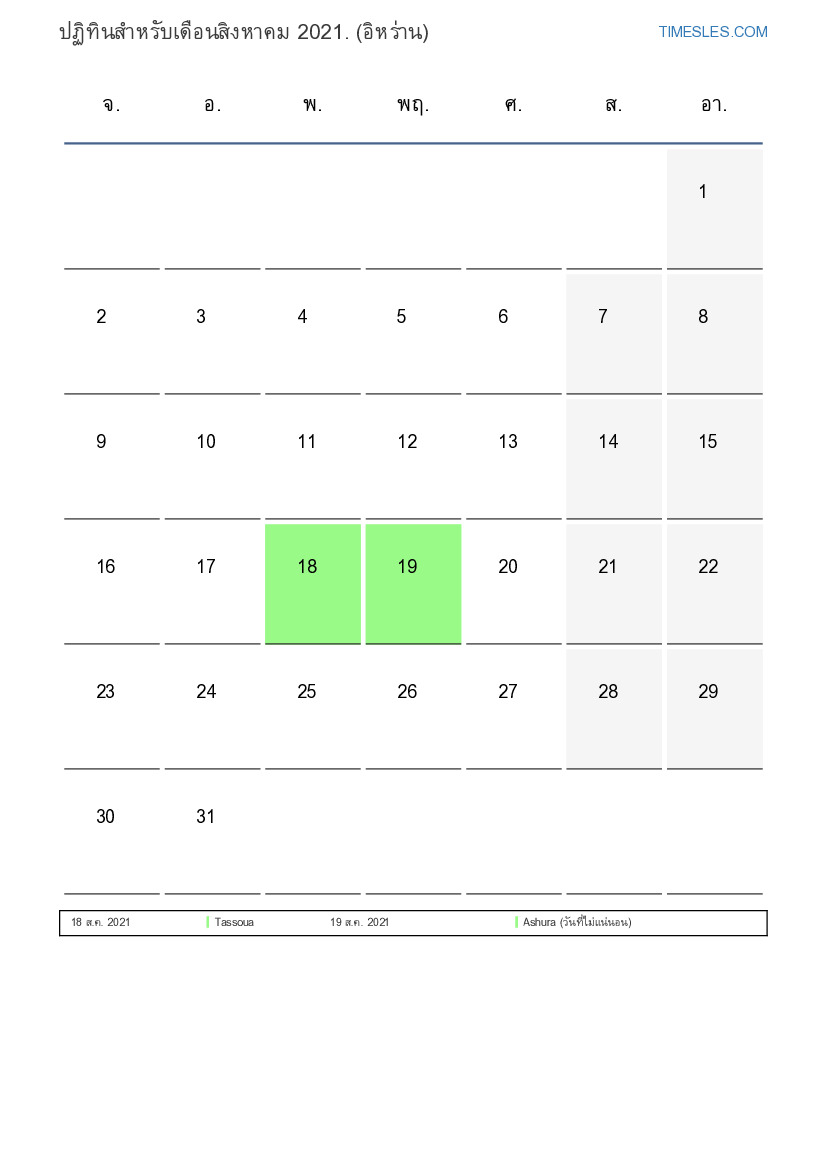 ปฏิทินวันหยุดและวันหยุดสุดสัปดาห์สิงหาคม 2021 สำหรับอิหร่าน