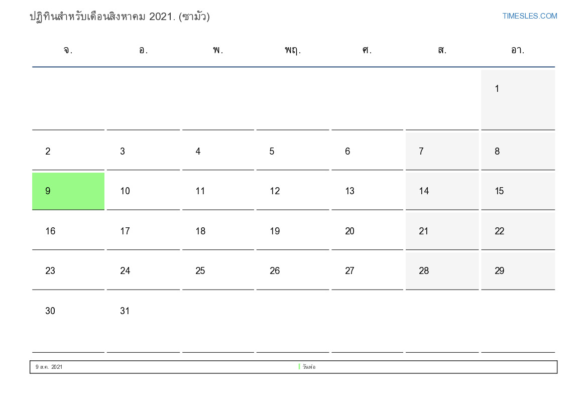 เดือนสิงหาคมมี 31 วัน วัน นี่คือ 8 เดือนของปี 2021 ฤดูกาลของปี: ฤดูร้อน เดือนสิงหาคมเริ่มในวันอาทิตย์และสิ้นสุดในวันอังคาร ในเดือนสิงหาคม 2021 มี1 วันหยุดและวันหยุดในซามัว