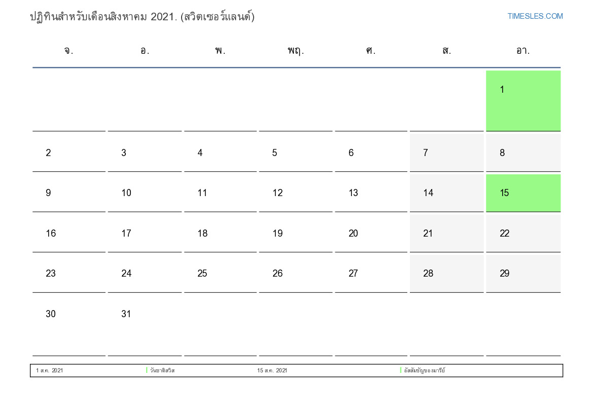 ดาวน์โหลดและพิมพ์ปฏิทิน PDF พร้อมวันหยุดและวันหยุดสุดสัปดาห์สำหรับเดือนสิงหาคม 2021 สำหรับสวิตเซอร์แลนด์