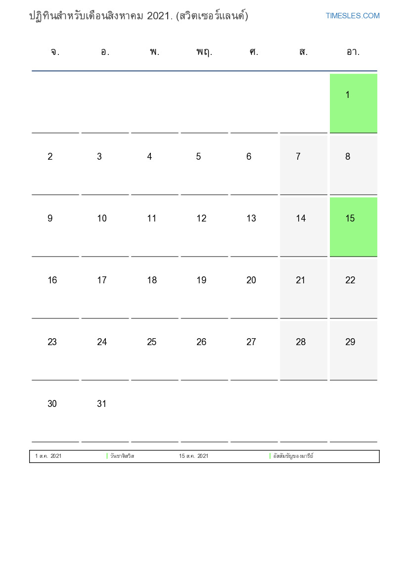 ปฏิทินเดือนสิงหาคม 2021 สำหรับสวิตเซอร์แลนด์