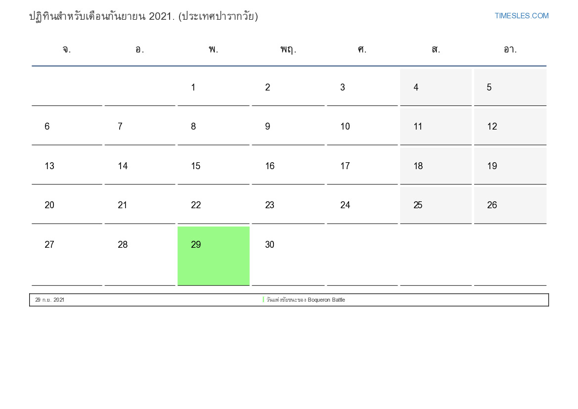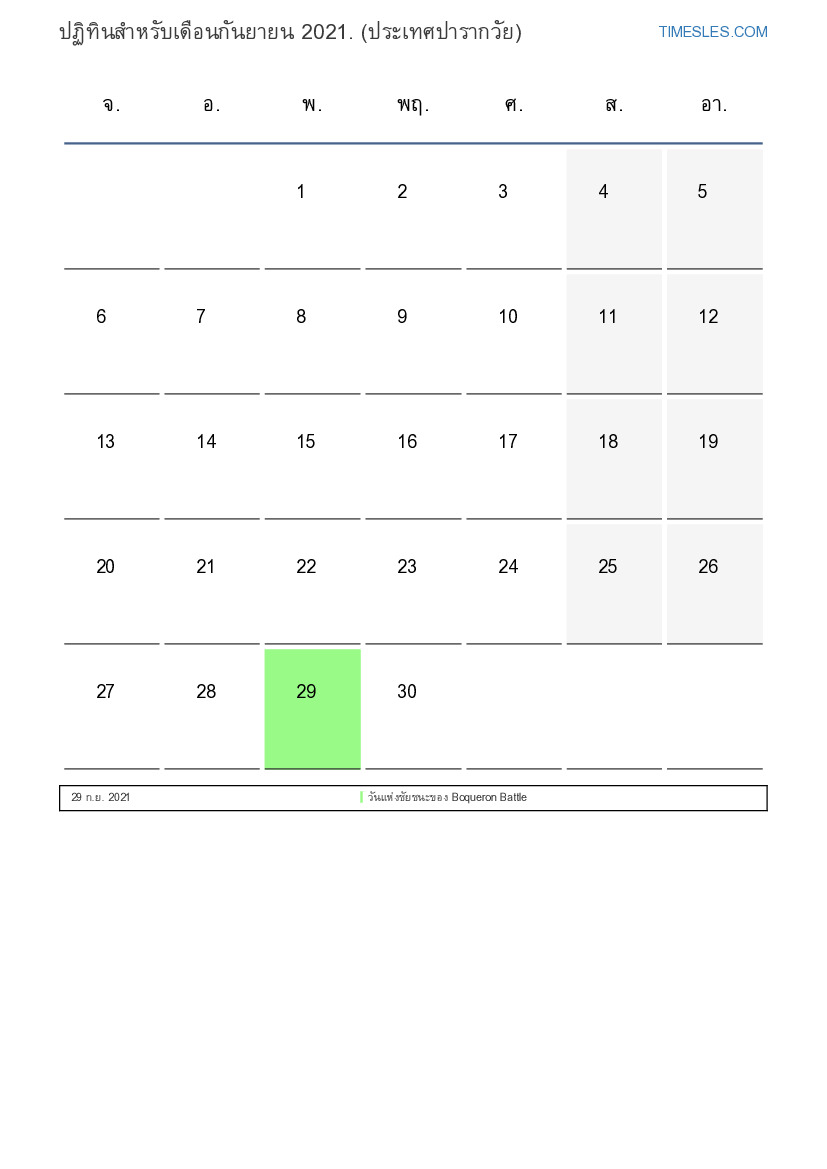 ดาวน์โหลดและพิมพ์ปฏิทิน PDF พร้อมวันหยุดและวันหยุดสุดสัปดาห์สำหรับเดือนกันยายน 2021 สำหรับปารากวัย