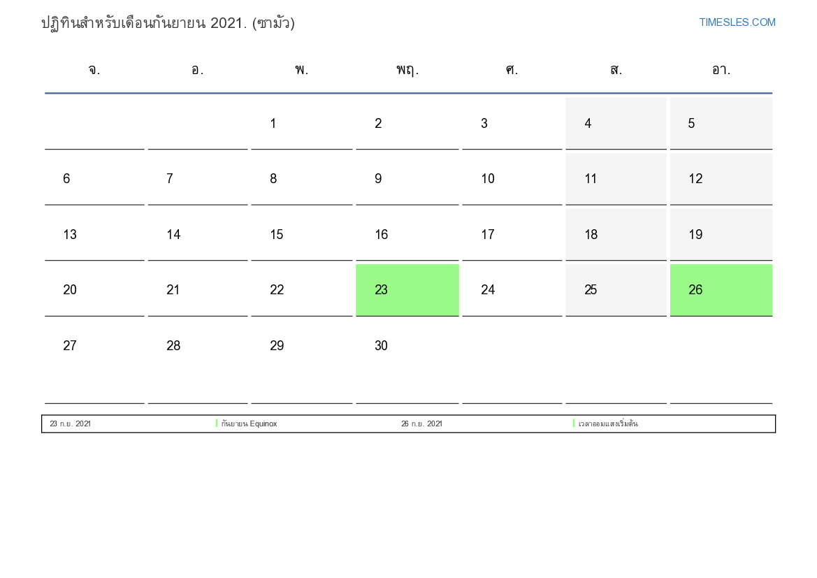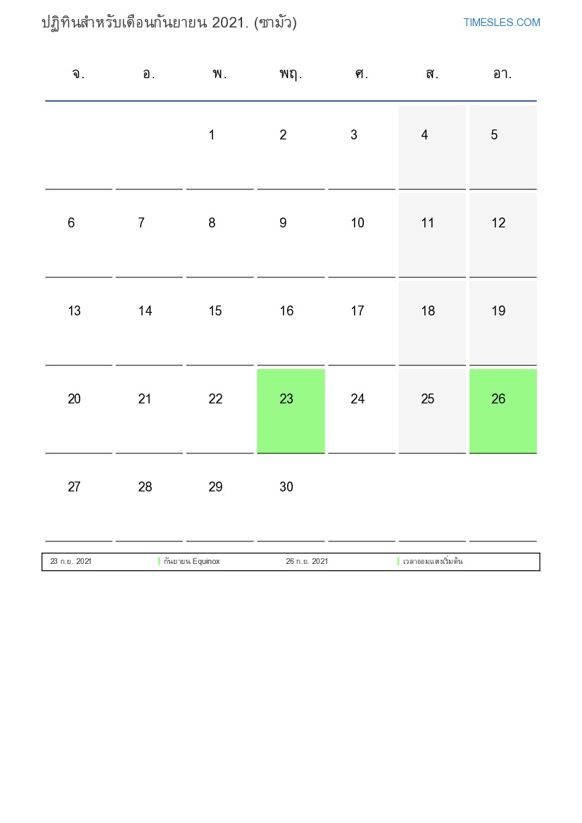 เดือนกันยายนมี 30 วัน วัน นี่คือ 9 เดือนของปี 2021 ฤดูกาลของปี: ฤดูใบไม้ร่วง เดือนกันยายนเริ่มในวันพุธและสิ้นสุดในวันพฤหัสบดีที่ ในเดือนกันยายน 2021 มี2 วันหยุดและวันหยุดในซามัว