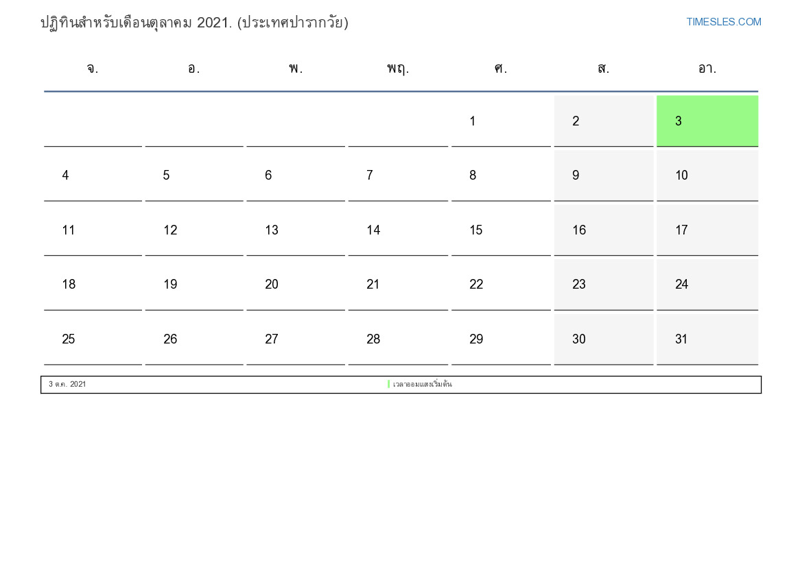 ดาวน์โหลดและพิมพ์ปฏิทิน PDF พร้อมวันหยุดและวันหยุดสุดสัปดาห์สำหรับเดือนตุลาคม 2021 สำหรับปารากวัย
