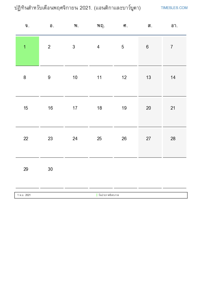 ปฏิทินเดือนพฤศจิกายน 2021 สำหรับแอนติกาและบาร์บูดา