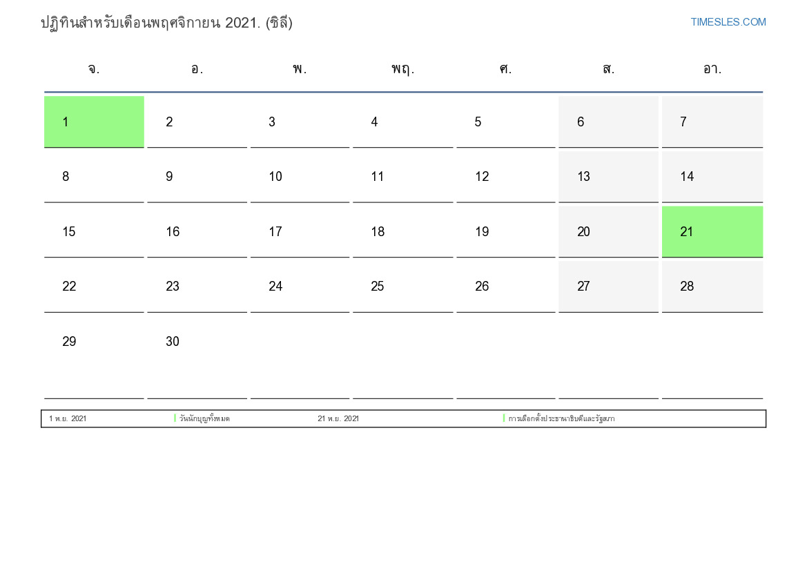 เดือนพฤศจิกายนมี 30 วัน วัน นี่คือ 11 เดือนของปี 2021 ฤดูกาลของปี: ฤดูใบไม้ร่วง เดือนพฤศจิกายนเริ่มในวันจันทร์และสิ้นสุดในวันอังคาร ในเดือนพฤศจิกายน 2021 มี2 วันหยุดและวันหยุดในชิลี