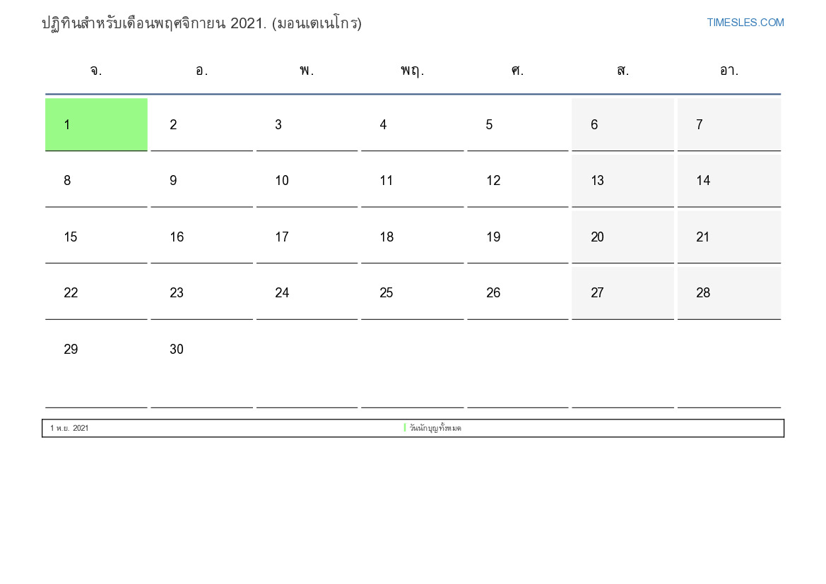 เดือนพฤศจิกายนมี 30 วัน วัน นี่คือ 11 เดือนของปี 2021 ฤดูกาลของปี: ฤดูใบไม้ร่วง เดือนพฤศจิกายนเริ่มในวันจันทร์และสิ้นสุดในวันอังคาร ในเดือนพฤศจิกายน 2021 มี1 วันหยุดและวันหยุดในมอนเตเนโกร
