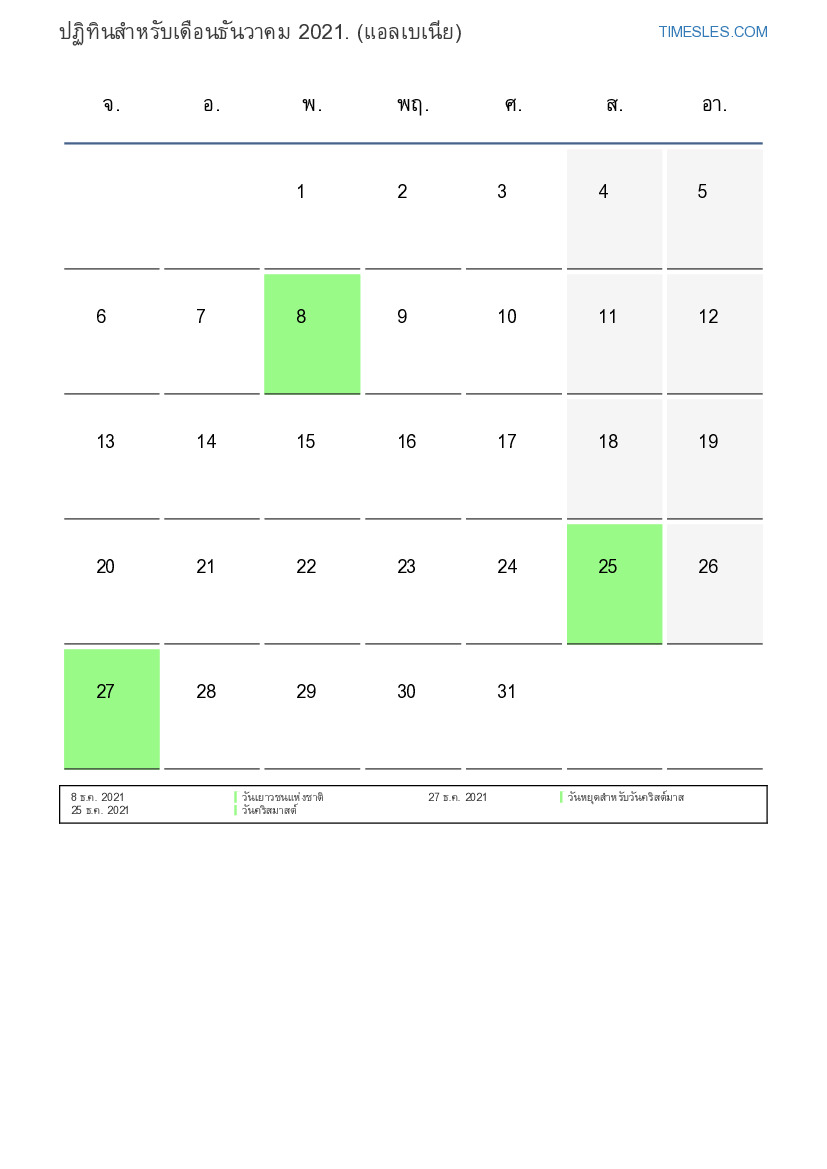 ดาวน์โหลดและพิมพ์ปฏิทิน PDF พร้อมวันหยุดและวันหยุดสุดสัปดาห์สำหรับเดือนธันวาคม 2021 สำหรับแอลเบเนีย