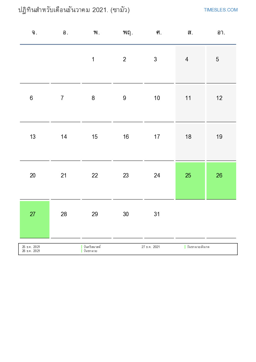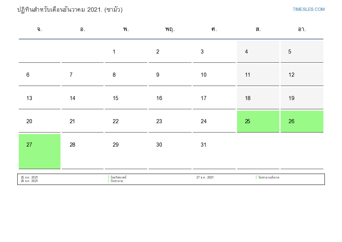 เดือนธันวาคมมี 31 วัน วัน นี่คือ 12 เดือนของปี 2021 ฤดูกาลของปี: ฤดูหนาว เดือนธันวาคมเริ่มในวันพุธและสิ้นสุดในวันศุกร์ ในเดือนธันวาคม 2021 มี4 วันหยุดและวันหยุดในซามัว