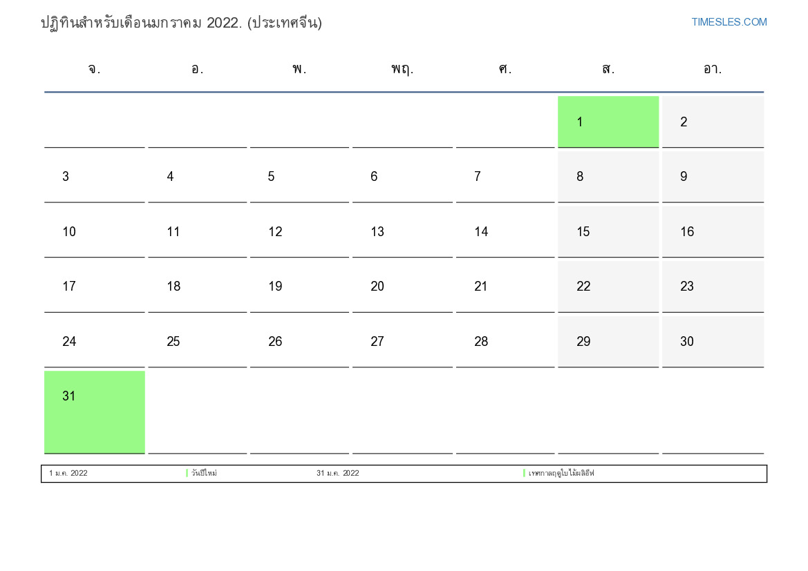 ปฏิทินวันหยุดและวันหยุดสุดสัปดาห์มกราคม 2022 สำหรับประเทศจีน