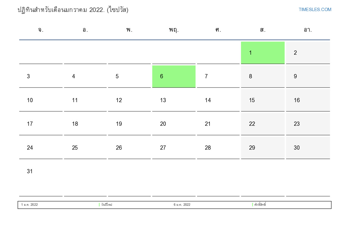เดือนมกราคมมี 31 วัน วัน นี่คือ 1 เดือนของปี 2022 ฤดูกาลของปี: ฤดูหนาว เดือนมกราคมเริ่มวันเสาร์และสิ้นสุดในวันจันทร์ ในเดือนมกราคม 2022 มี2 วันหยุดและวันหยุดในไซปรัส