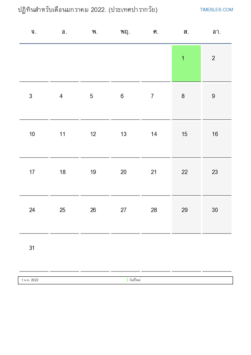 ดาวน์โหลดและพิมพ์ปฏิทิน PDF พร้อมวันหยุดและวันหยุดสุดสัปดาห์สำหรับเดือนมกราคม 2022 สำหรับปารากวัย
