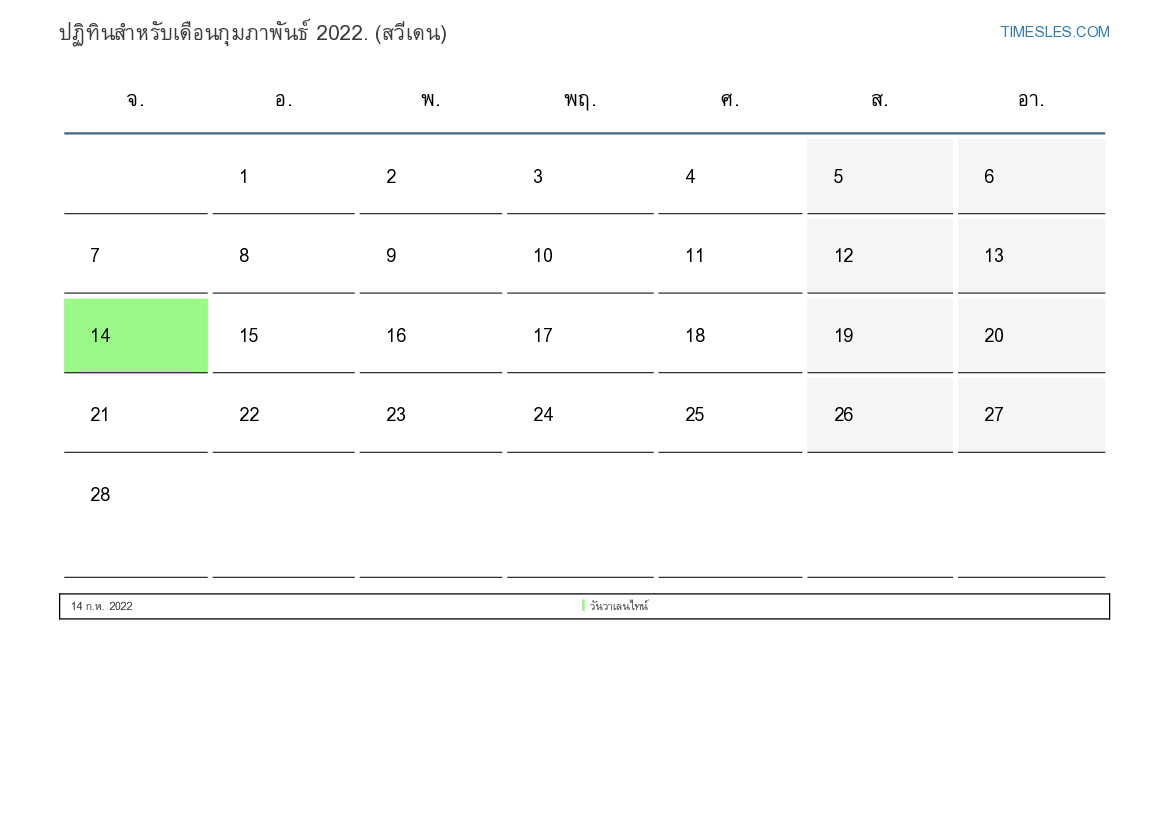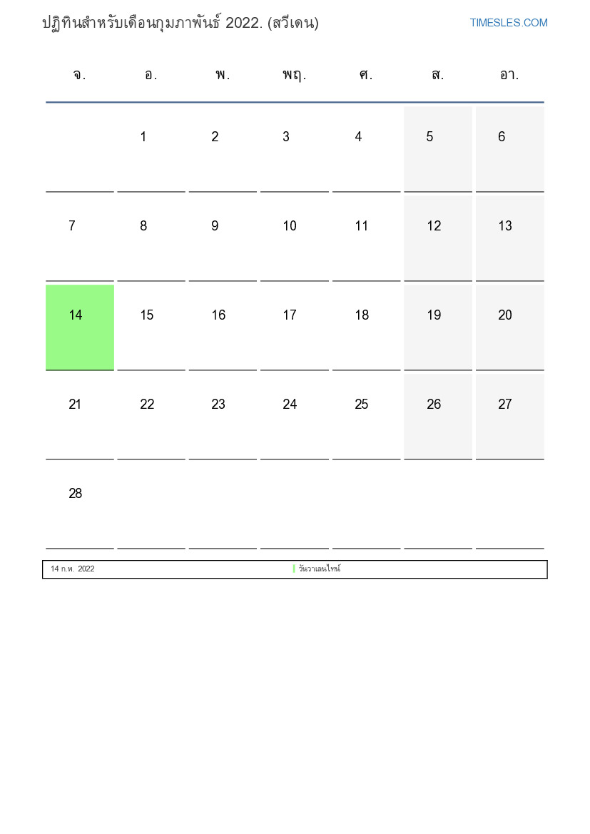 ดาวน์โหลดและพิมพ์ปฏิทิน PDF พร้อมวันหยุดและวันหยุดสุดสัปดาห์สำหรับเดือนกุมภาพันธ์ 2022 สำหรับสวีเดน