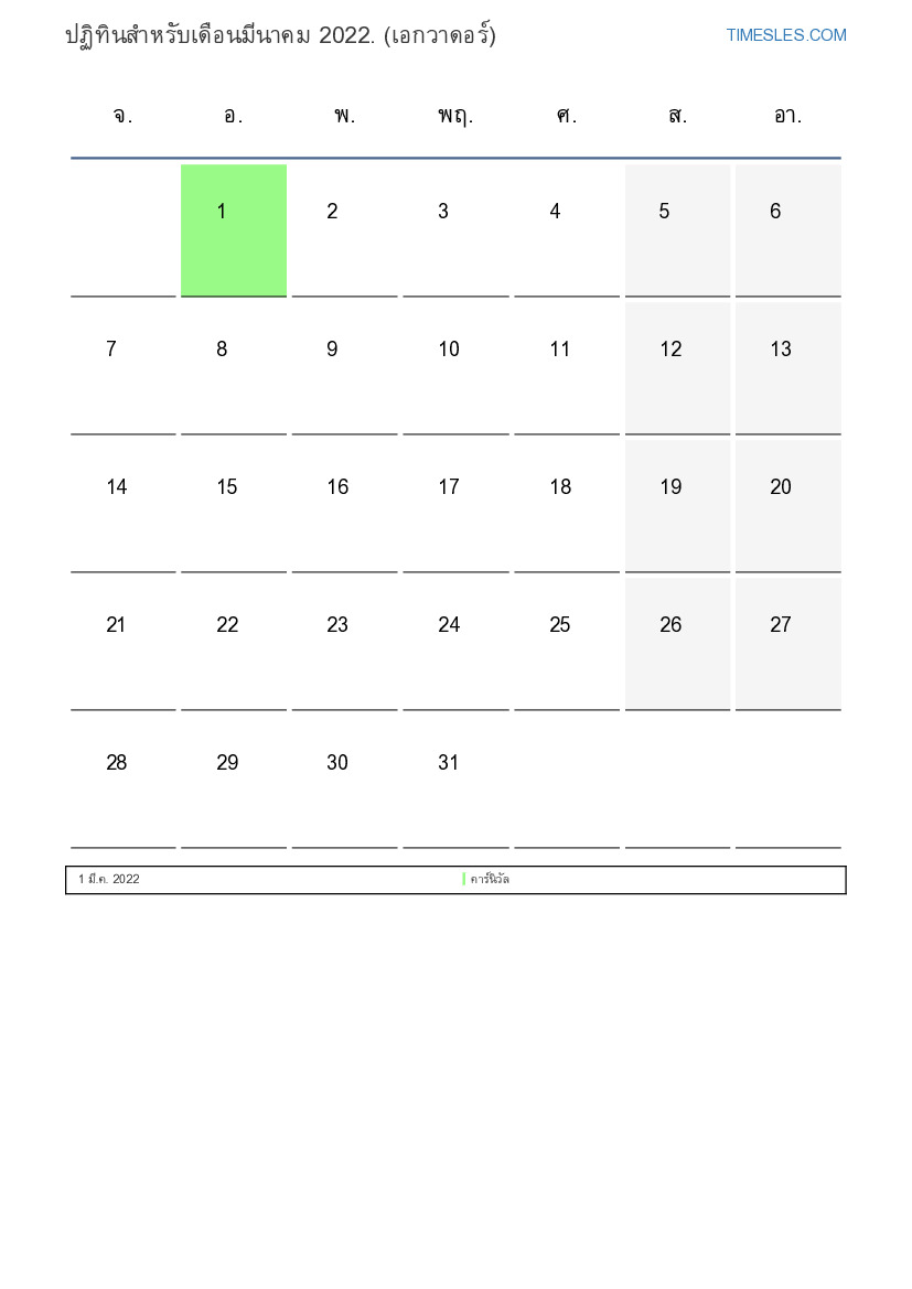 ดาวน์โหลดและพิมพ์ปฏิทิน PDF พร้อมวันหยุดและวันหยุดสุดสัปดาห์สำหรับเดือนมีนาคม 2022 สำหรับเอกวาดอร์