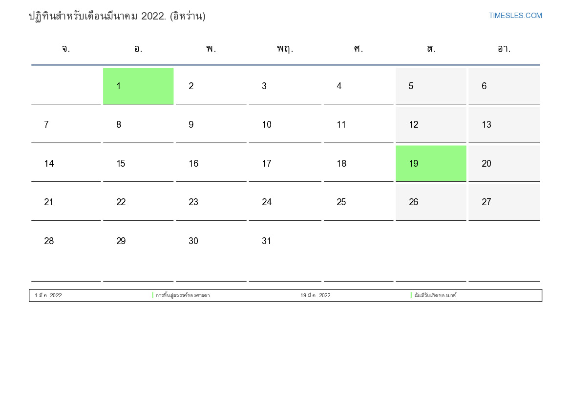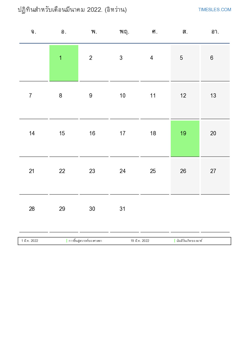 ดาวน์โหลดและพิมพ์ปฏิทิน PDF พร้อมวันหยุดและวันหยุดสุดสัปดาห์สำหรับเดือนมีนาคม 2022 สำหรับอิหร่าน
