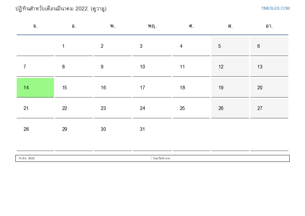 เดือนมีนาคมมี 31 วัน วัน นี่คือ 3 เดือนของปี 2022 ฤดูกาลของปี: ฤดูใบไม้ผลิ เดือนมีนาคมเริ่มในวันอังคารและสิ้นสุดในวันพฤหัสบดีที่ ในเดือนมีนาคม 2022 มี2 วันหยุดและวันหยุดในตูวาลู