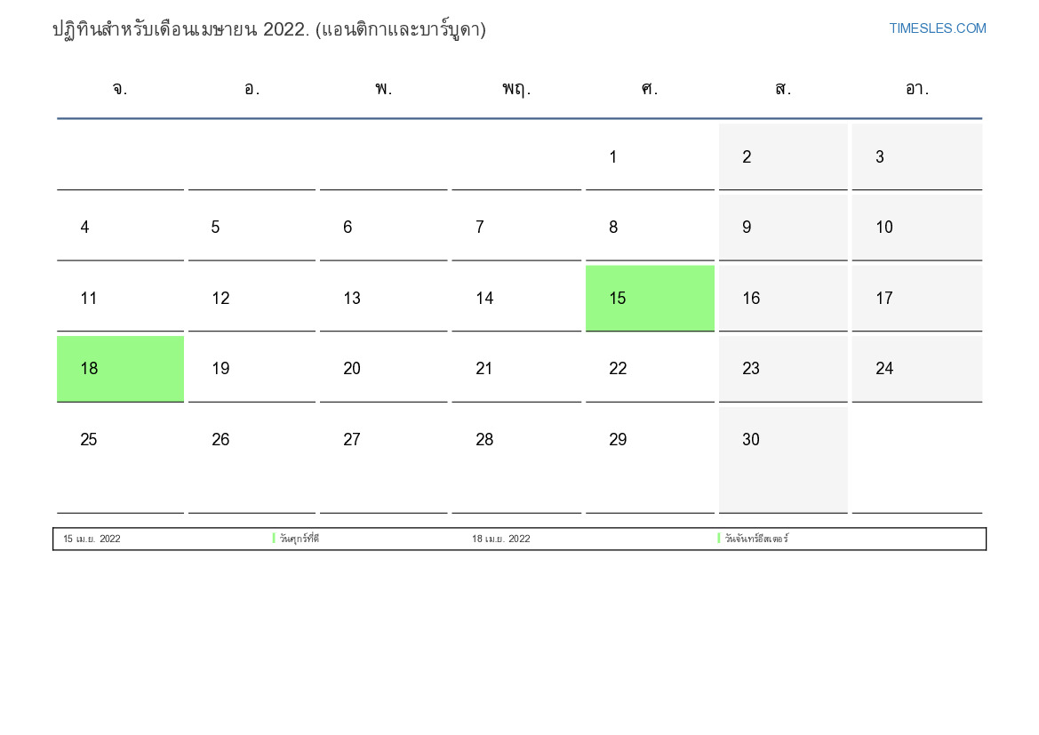 ดาวน์โหลดและพิมพ์ปฏิทิน PDF พร้อมวันหยุดและวันหยุดสุดสัปดาห์สำหรับเดือนเมษายน 2022 สำหรับแอนติกาและบาร์บูดา