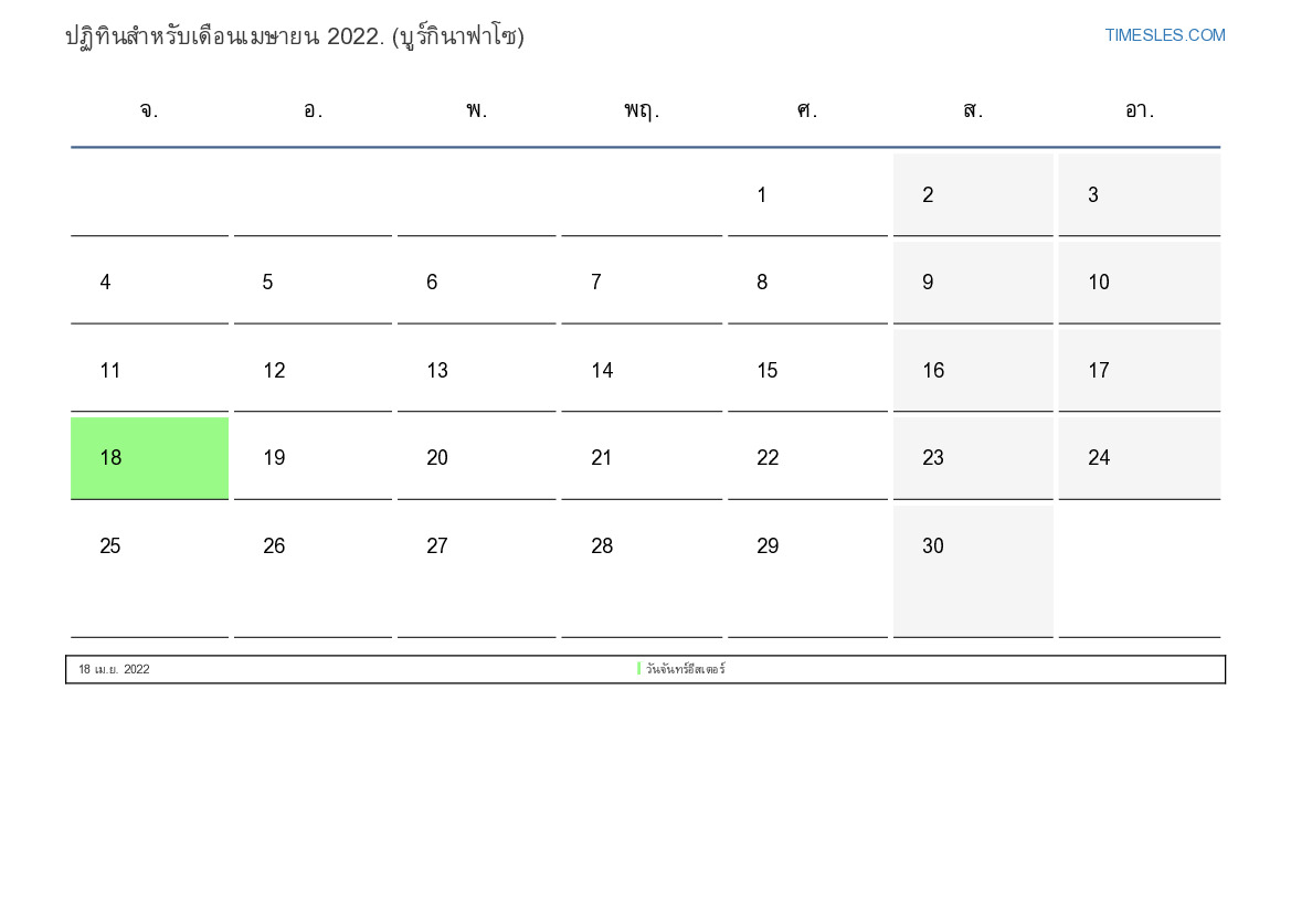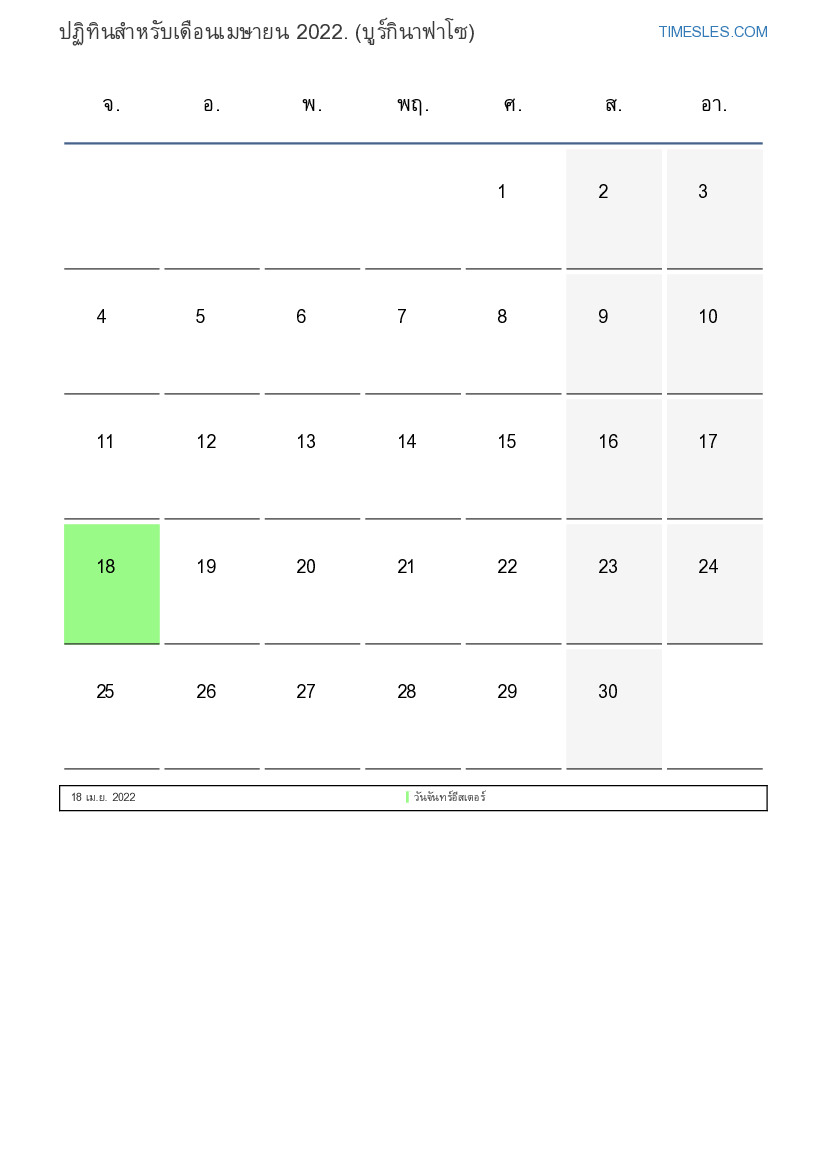 ปฏิทินวันหยุดและวันหยุดสุดสัปดาห์เมษายน 2022 สำหรับบูร์กินาฟาโซ