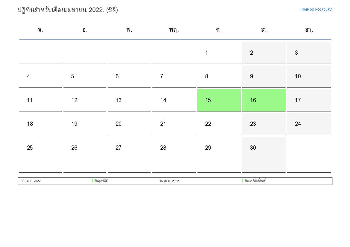 ปฏิทินวันหยุดและวันหยุดสุดสัปดาห์เมษายน 2022 สำหรับชิลี