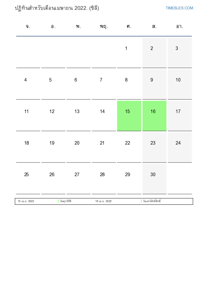 เดือนเมษายนมี 30 วัน วัน นี่คือ 4 เดือนของปี 2022 ฤดูกาลของปี: ฤดูใบไม้ผลิ เดือนเมษายนเริ่มในวันศุกร์และสิ้นสุดวันเสาร์ ในเดือนเมษายน 2022 มี4 วันหยุดและวันหยุดในชิลี