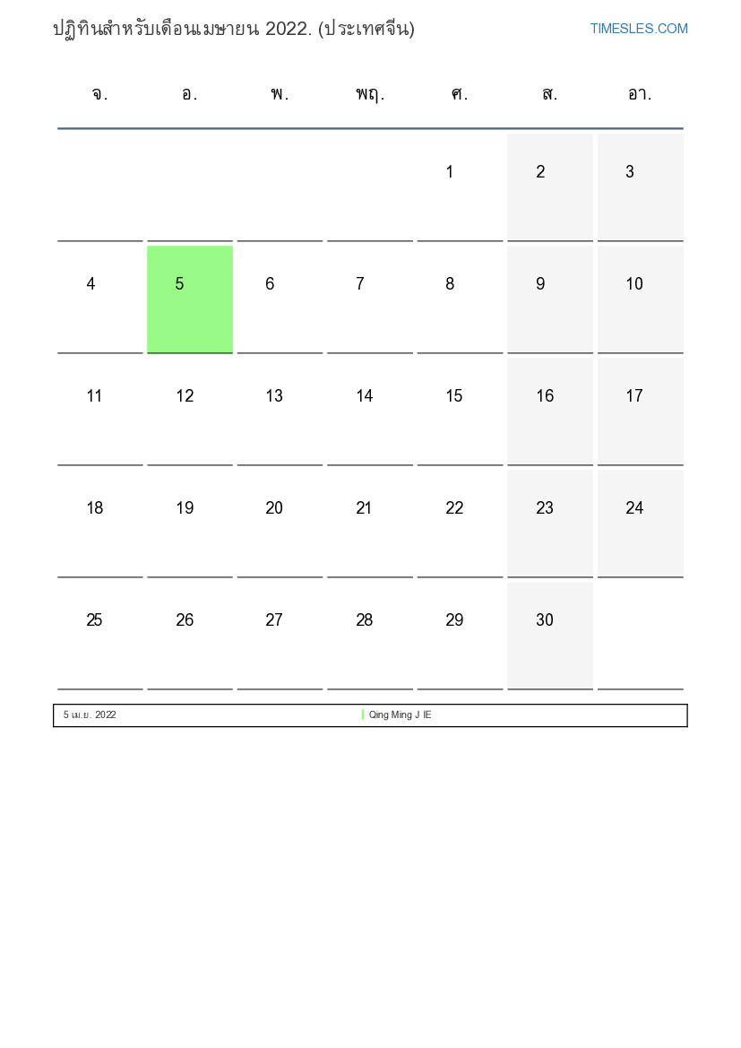 ปฏิทินเดือนเมษายน 2022 สำหรับประเทศจีน