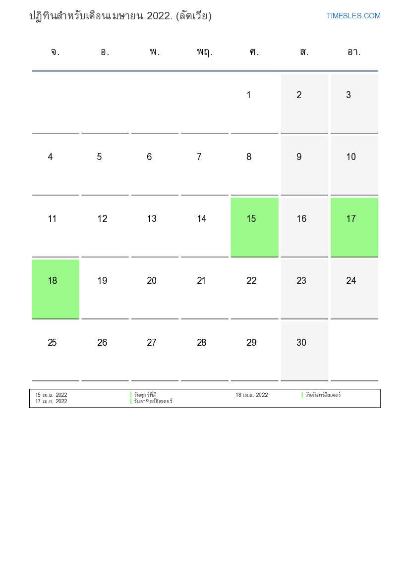 ปฏิทินวันหยุดและวันหยุดสุดสัปดาห์เมษายน 2022 สำหรับลัตเวีย