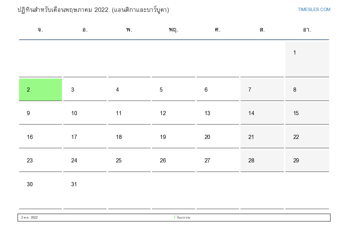 ปฏิทินเดือนพฤษภาคม 2022 สำหรับแอนติกาและบาร์บูดา