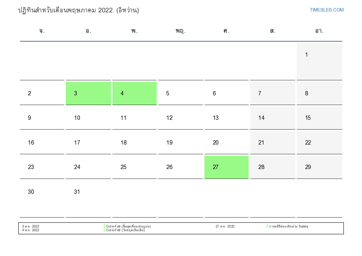 ดาวน์โหลดและพิมพ์ปฏิทิน PDF พร้อมวันหยุดและวันหยุดสุดสัปดาห์สำหรับเดือนพฤษภาคม 2022 สำหรับอิหร่าน
