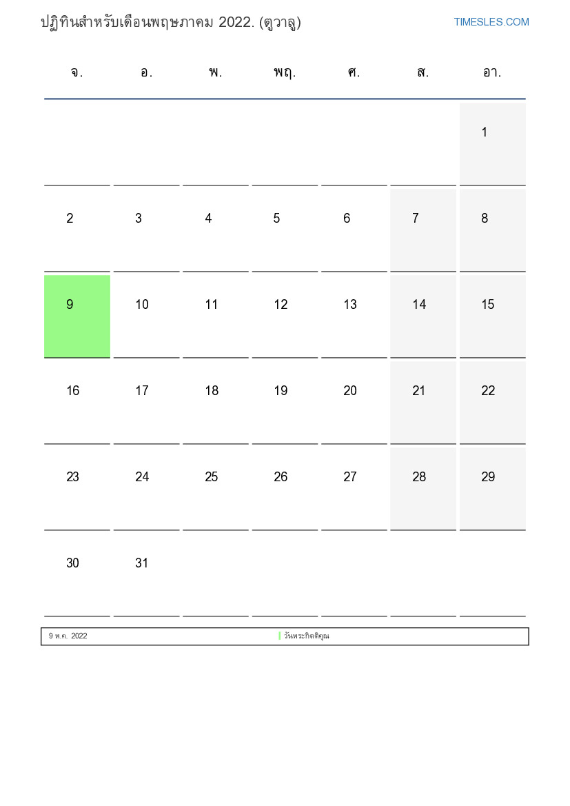 ปฏิทินแนวนอนโดยไม่มีวันหยุดเป็นเวลาหนึ่งเดือน