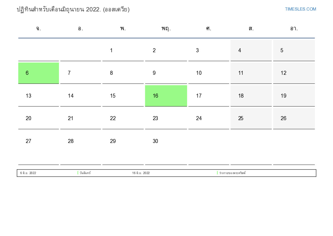 ปฏิทินวันหยุดและวันหยุดสุดสัปดาห์มิถุนายน 2022 สำหรับออสเตรีย